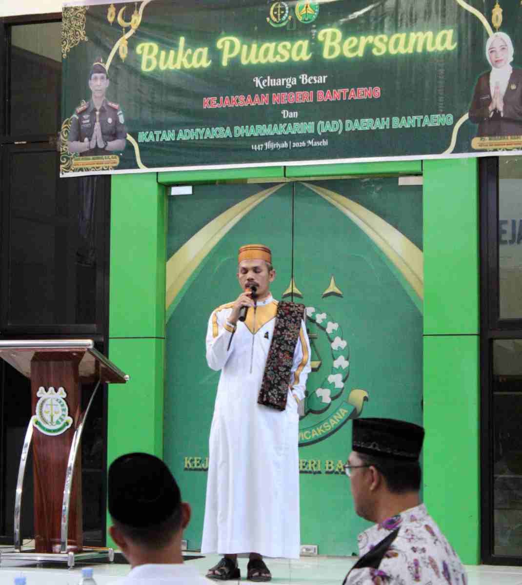 Kepala Kejaksaan Negeri (Kajari) Bantaeng, Hadi Sukma Siregar, S.H., C.N saat menyampaikan sambutan sebelum dilanjutkan dengan penampilan da’i cilik, Ahmad Mubarak yang berhasil meraih juara Harapan 1 di lomba Pildacil tingkat Kejaksaan Tinggi Sulawesi Selatan 2026, mengucapkan rasa syukur serta terima kasih atas terselenggaranya acara buka puasa bersama ini.