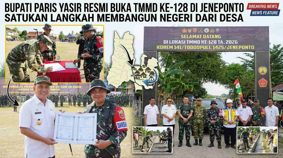 Bupati Jeneponto, H. Paris Yasir, secara resmi membuka pelaksanaan program TNI Manunggal Membangun Desa (TMMD) Reguler Ke-128 Tahun Anggaran 2026.
