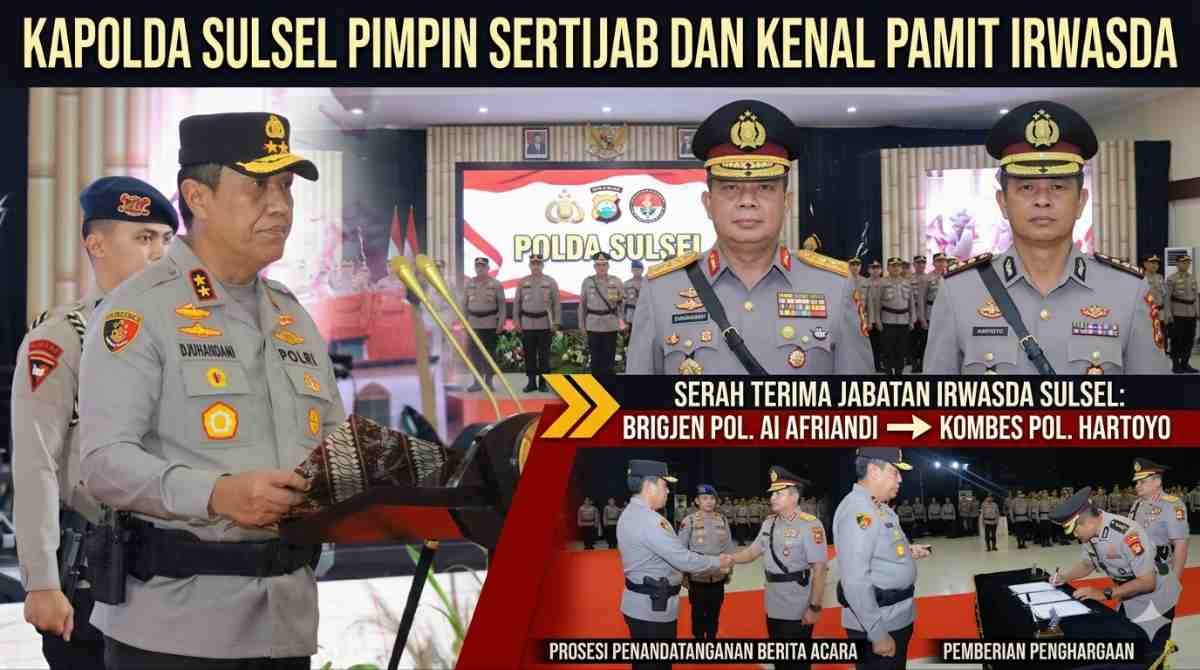 Dalam prosesi upacara, terjadi rotasi jabatan strategis di lingkungan internal pengawasan Polri wilayah Sulsel. Jabatan Irwasda Polda Sulsel diserahkan oleh Brigjen Pol. Ai Afriandi, S.H., S.I.K., M.M., kepada Kombes Pol. Hartoyo, S.I.K., M.H.