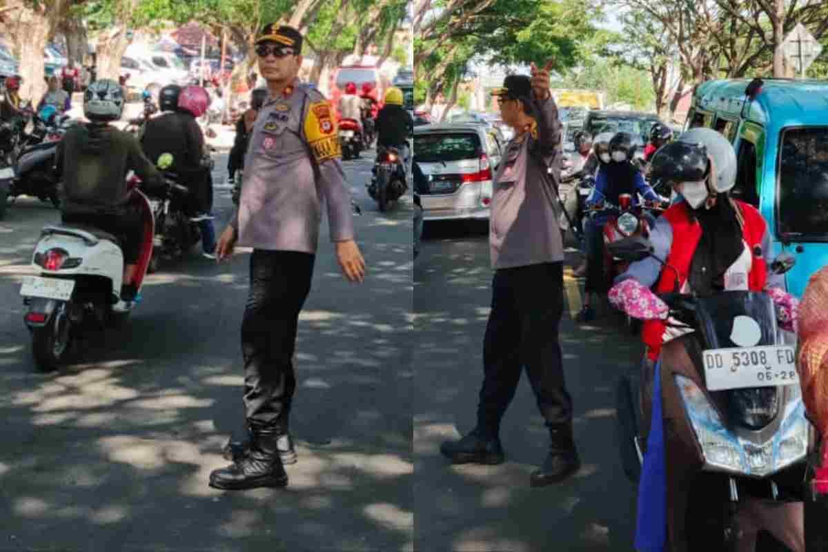 Dengan mengenakan seragam dinas, Kompol Andi Ikbal tampak sigap mengatur kendaraan yang melintas di sekitar area pasar yang cukup padat pada pagi hari.