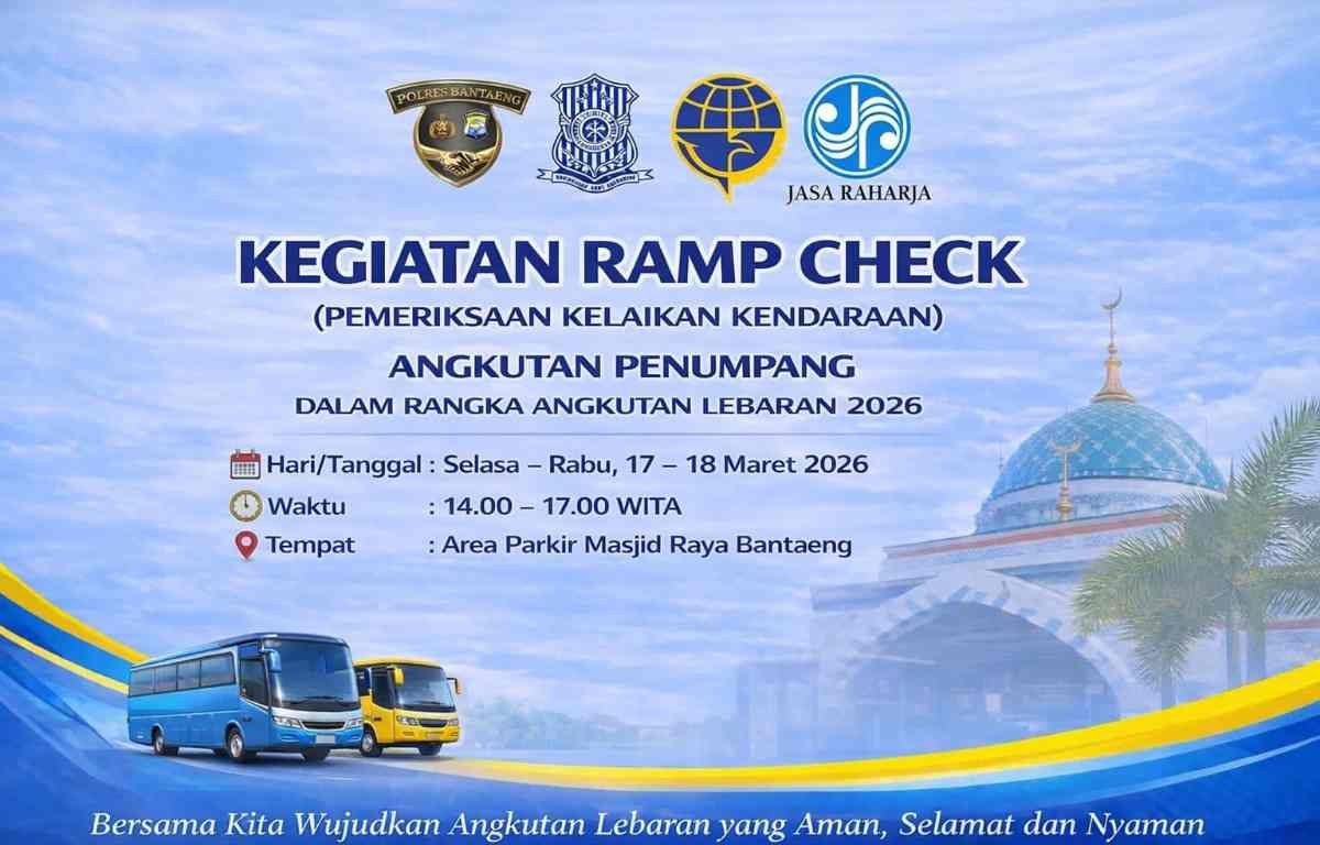 Menjelang arus mudik Lebaran 2026, Dinas Perhubungan Pemkab Bantaeng menggandeng SatLantas Polres Bantaeng, Dinas Kesehatan Bantaeng dan Jasa Raharja, menggelar kegiatan “Ramp Chek” di Jalan Poros Nasional (Jalan Raya Lanto didepan Masjid Raya Bantaeng). Selasa dan Rabu, (17-18 Maret 2026).